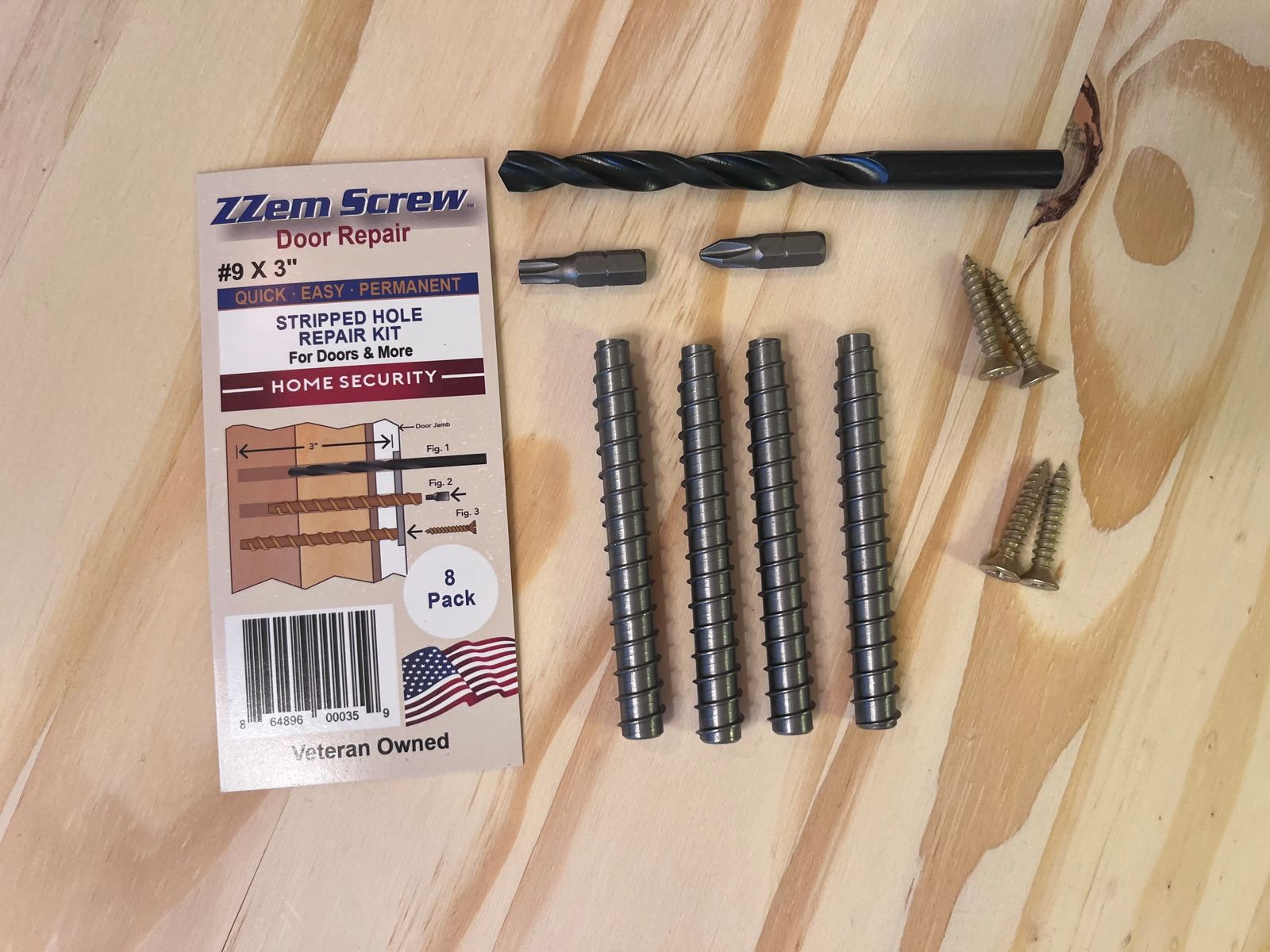 Each ZZem Screw Repair Kit includes everything you'll need, except a drill. There are multiple kit versions and sizes available, each for specific use cases.